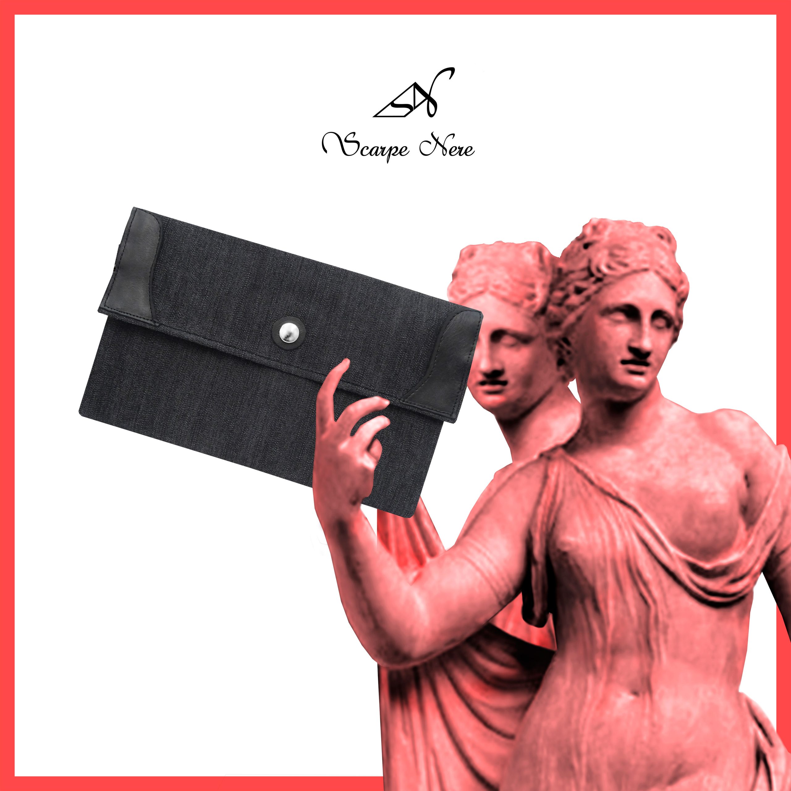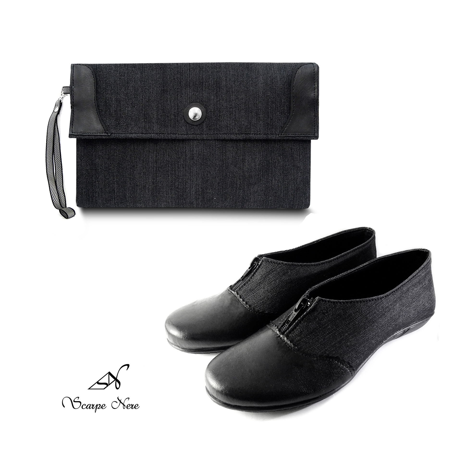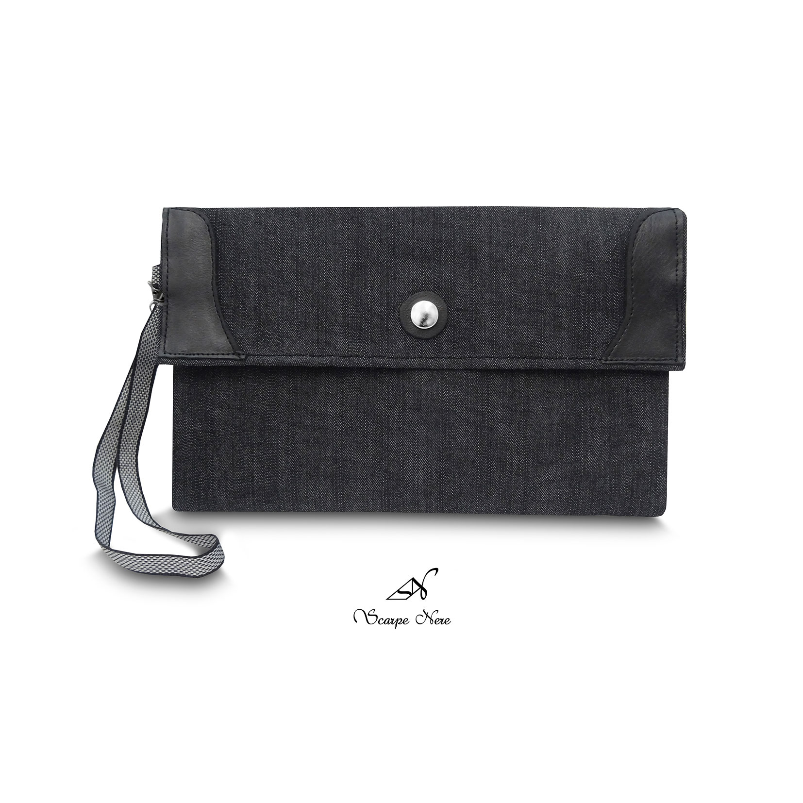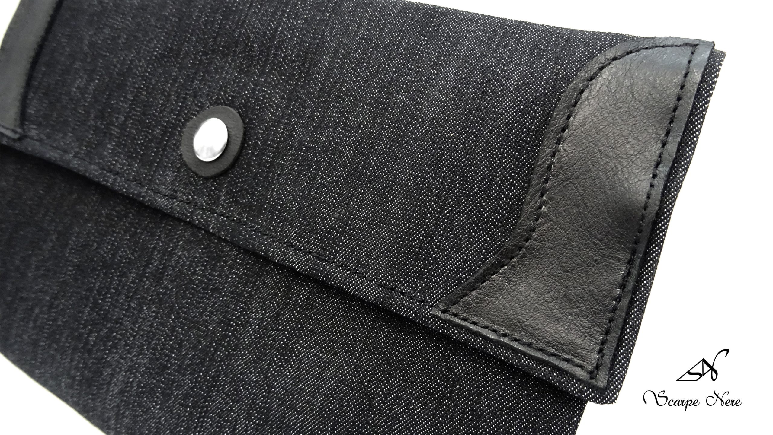 Material exterior: Denim Gris y Cuero Negro.